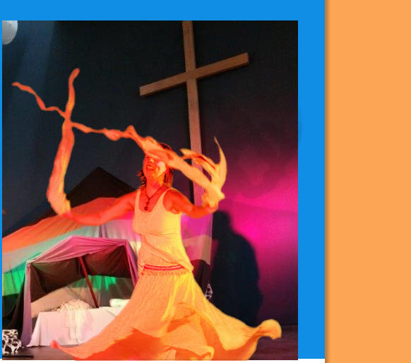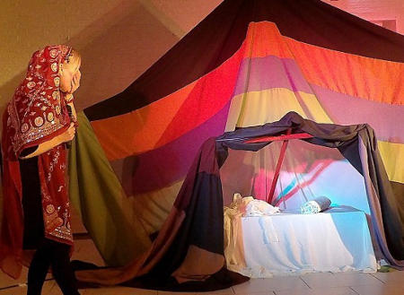 We beginnen de voorstelling met een lied. In dat lied vertellen we over de opstanding Jezus. Daarna spelen we met hulp van de kinderen het verhaal.
